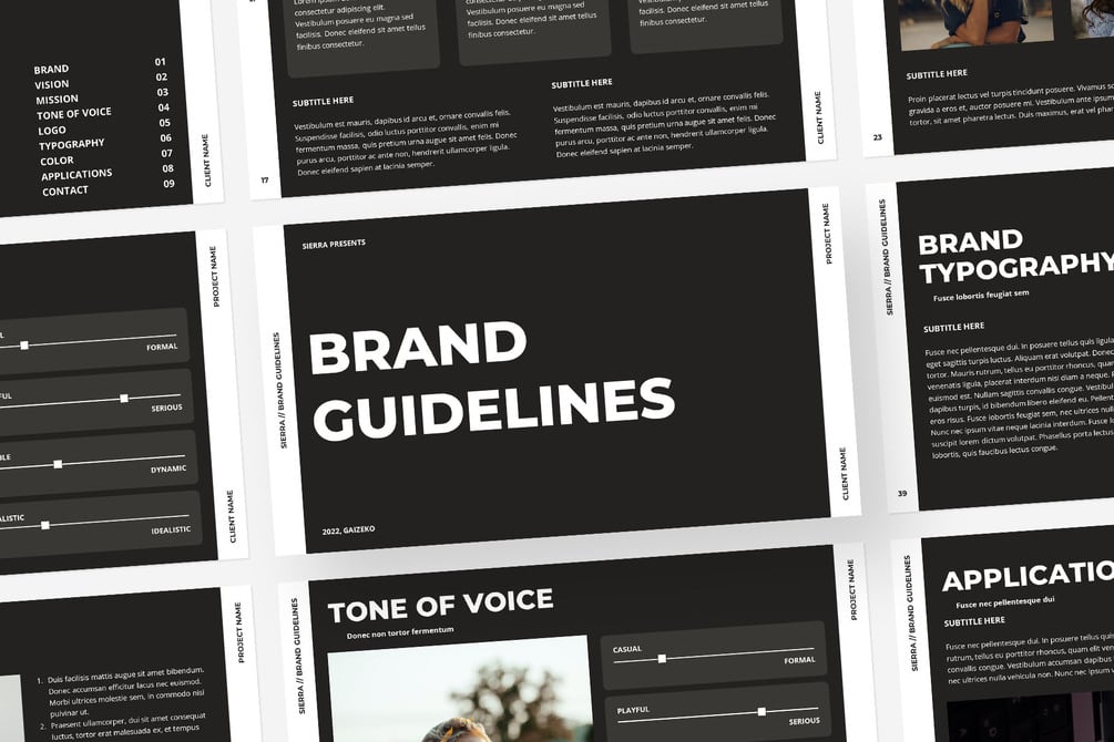 SIERRA is a minimal-style template for brand guidelines. This template can help you identify, build, and grow your brand or make it for your clients. This template comes with all the relevant sections needed for identity delivery from brand overview (vision, mission, values, etc.), logo, typography, color, and more.