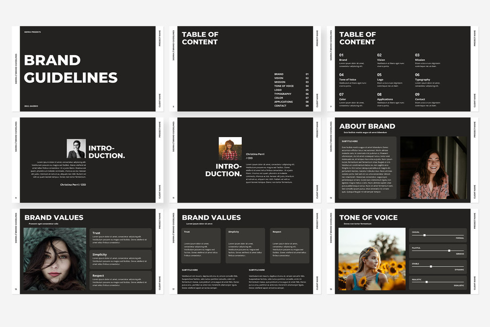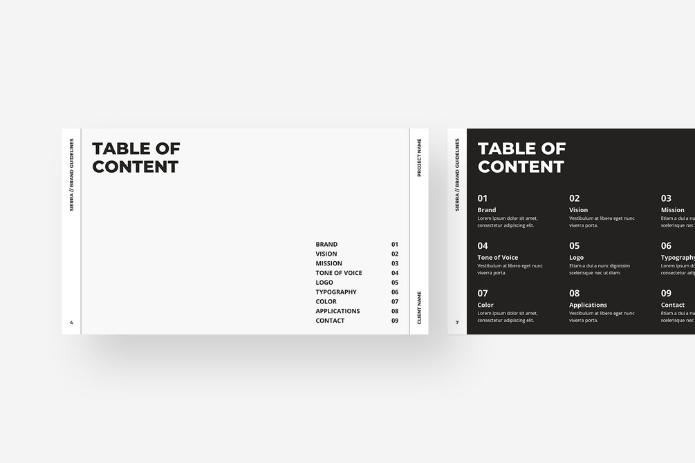 SIERRA is a minimal-style template for brand guidelines. This template can help you identify, build, and grow your brand or make it for your clients. This template comes with all the relevant sections needed for identity delivery from brand overview (vision, mission, values, etc.), logo, typography, color, and more.