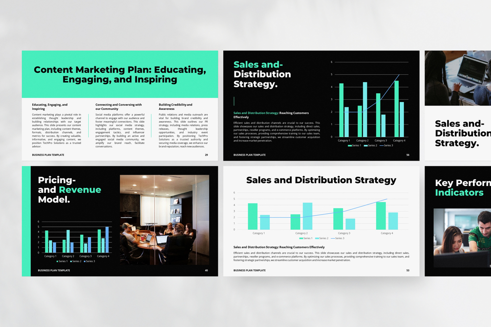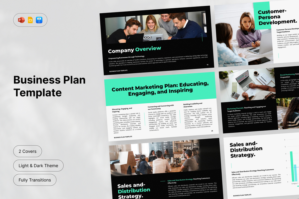This template offers a variety of layouts and designs to ensure your presentation stands out. The template includes sections for an executive summary, market analysis, competitive landscape, sales objectives, marketing strategies, financial projections, and more, allowing you to convey your vision, market potential, and growth opportunities with clarity and professionalism.